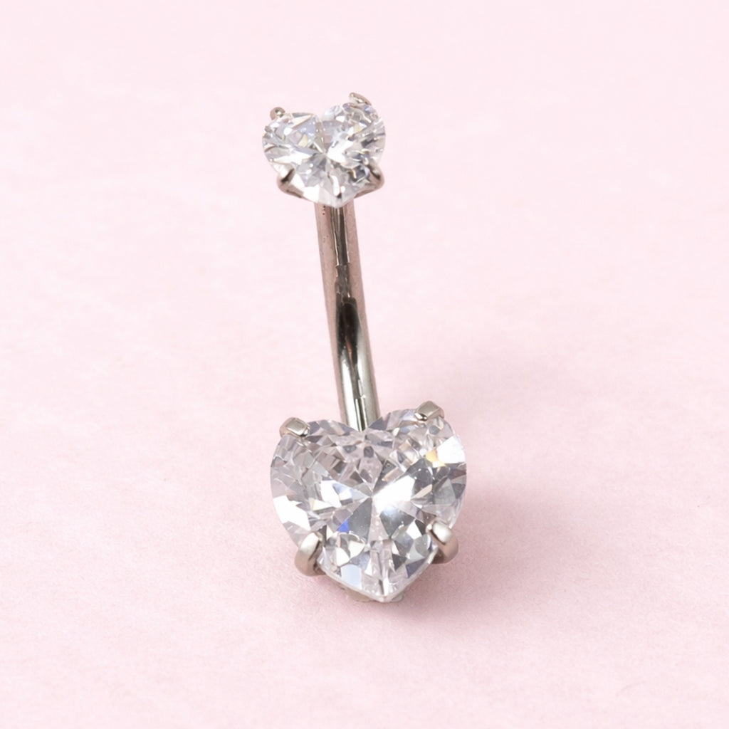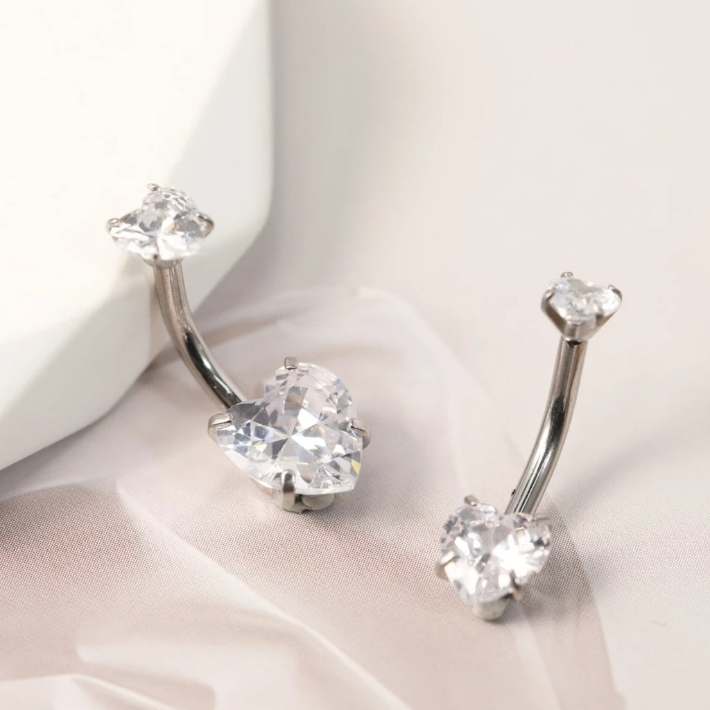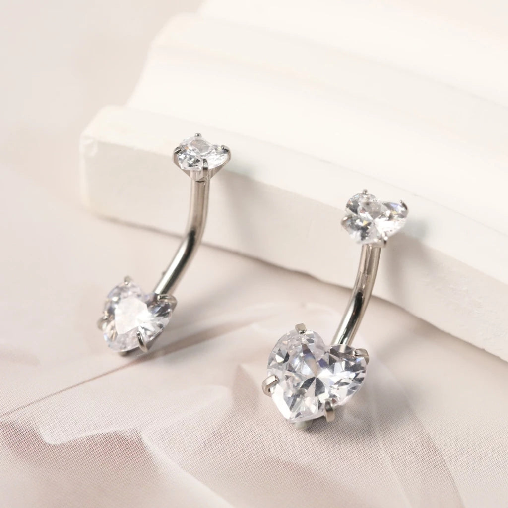Piercing modelo banana confeccionado em aço cirúrgico de alta qualidade, com duas zircônias em formato de coração, proporcionando brilho delicado e acabamento moderno. Ideal para perfuração no umbigo, unindo conforto, resistência e estilo.