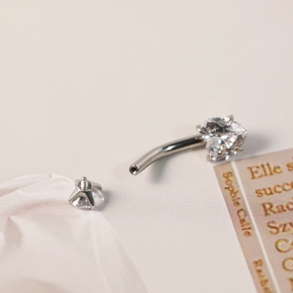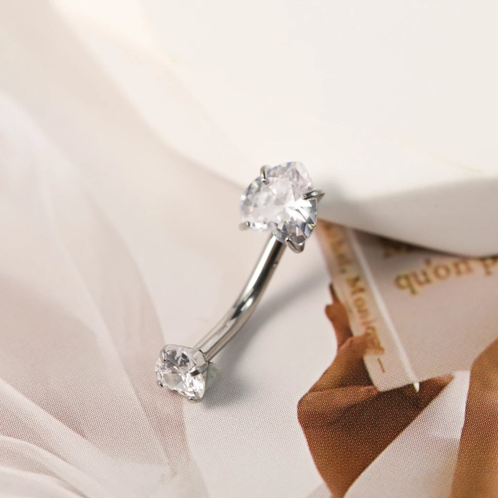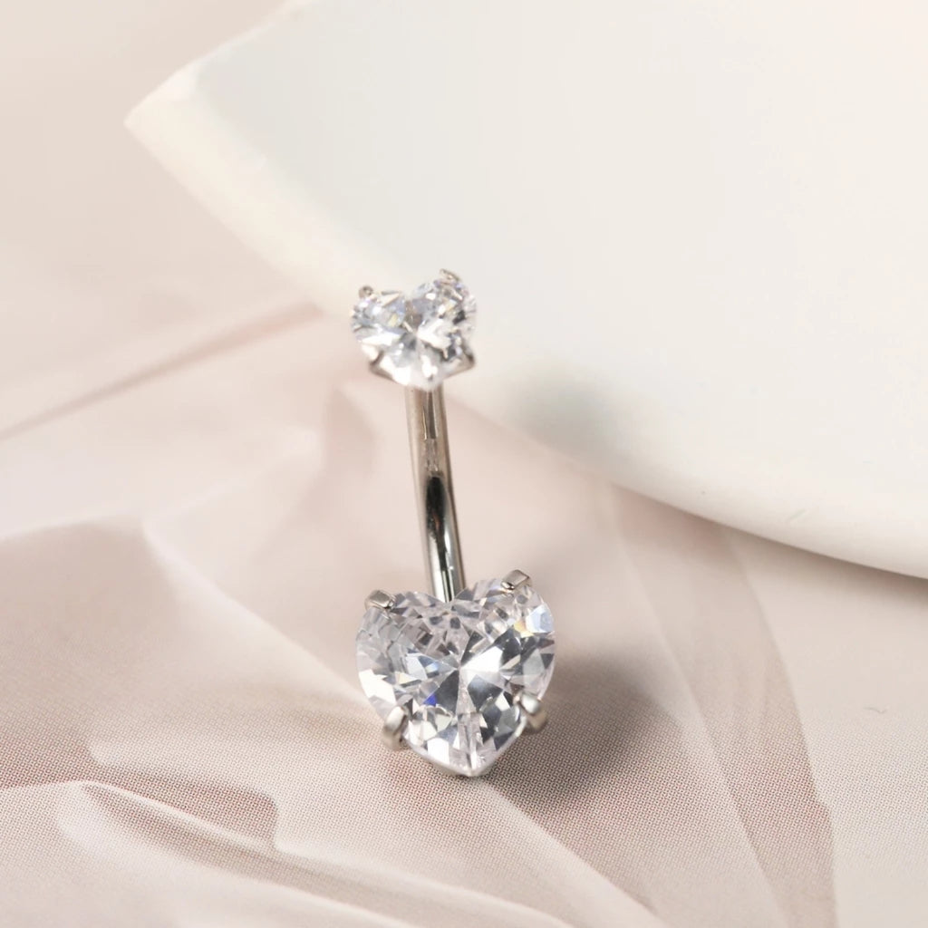 Piercing modelo banana confeccionado em aço cirúrgico de alta qualidade, com duas zircônias em formato de coração, proporcionando brilho delicado e acabamento moderno. Ideal para perfuração no umbigo, unindo conforto, resistência e estilo.