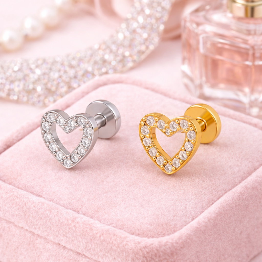 Peça versátil e charmosa para múltiplas perfurações da orelha. Design delicado de coração vazado adornado com zircônias cristal, oferecendo um brilho sofisticado e atemporal. Fabricado em aço hipoalergênico para segurança e conforto em uso prolongado, é ideal para clientes com peles sensíveis.